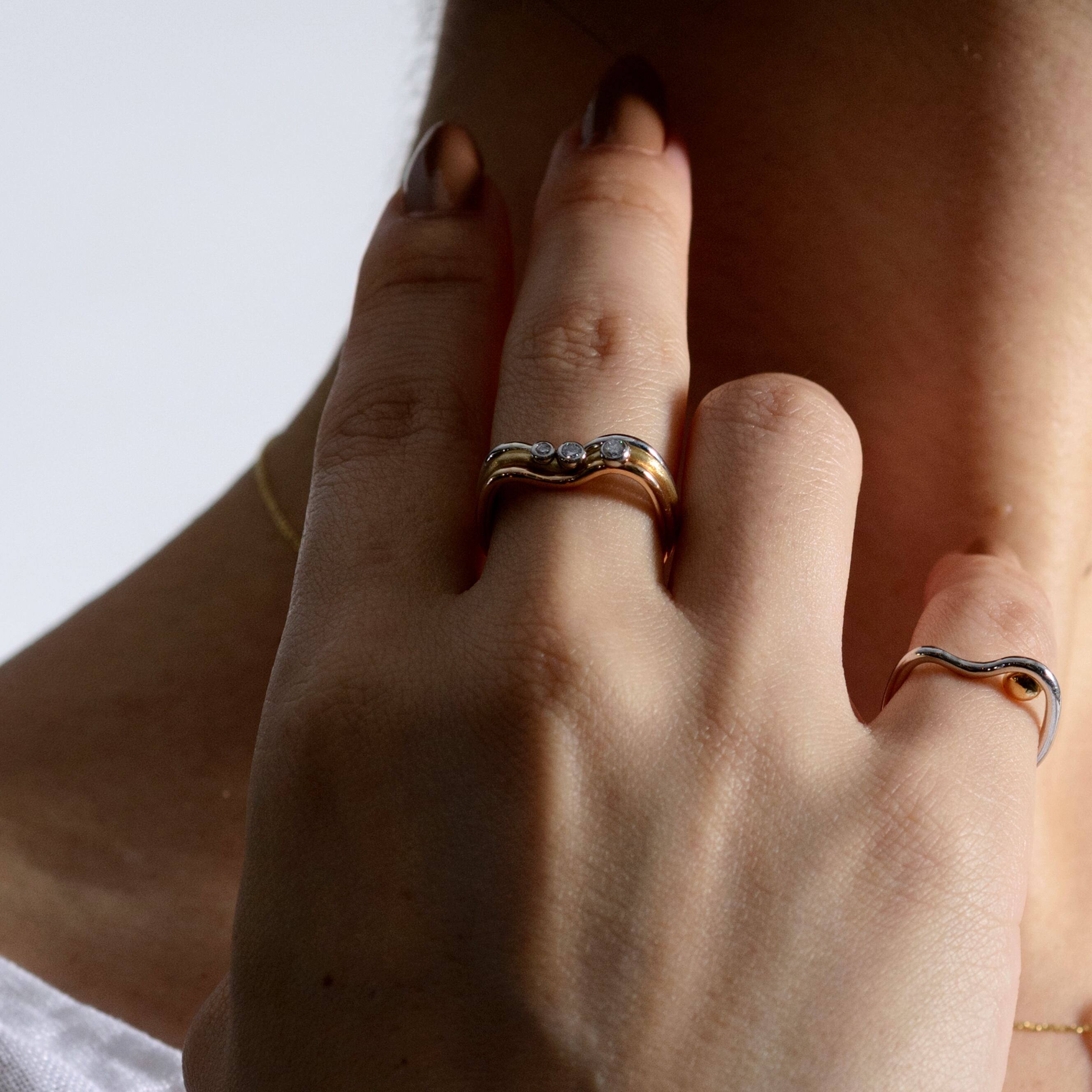 自然の中にある曲線をコンセプトに、ゆるやかなウェーブラインでMを表現いたしました。ちょこんとのっかった二点のダイヤが可愛らしく、シンプルながらも遊び心ある仕上がりです。単品でも、重ね付けしても手元が美しく上品でお洒落な印象になります。真円ではないデザインは、隙間があり複数の指にフィットしますので、実用性もあります。Silverの商品はデザインはそのままに地金をK18厚メッキをすることで変色が起こりにくい高品質な素材になります。