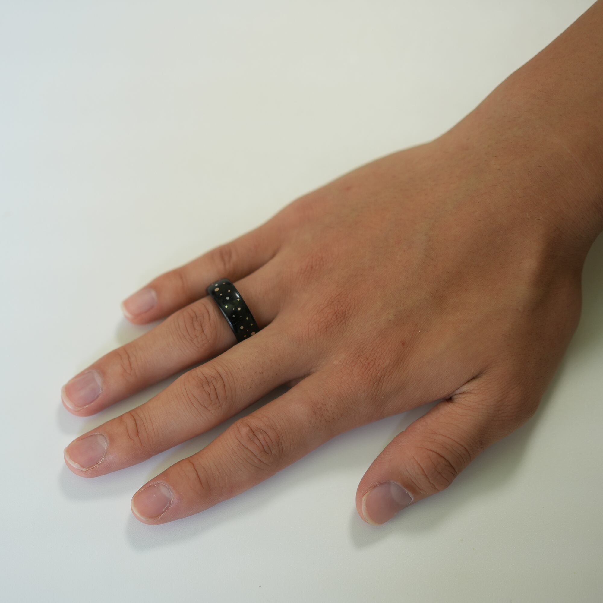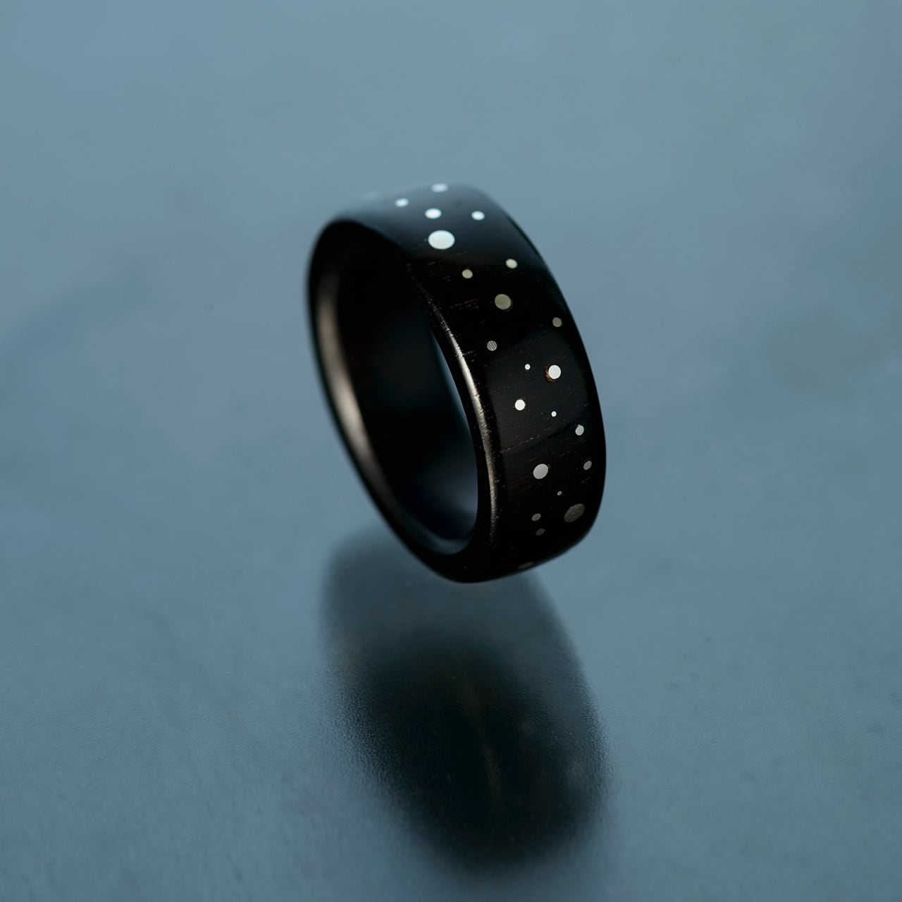 漆黒のアフリカン・ブラックウッドにsilver925の象嵌細工を施した、星空をイメージしたリングです。闇夜に浮かび上がる星の輝きを思わせるデザインで、指先を華やかに飾ります。
