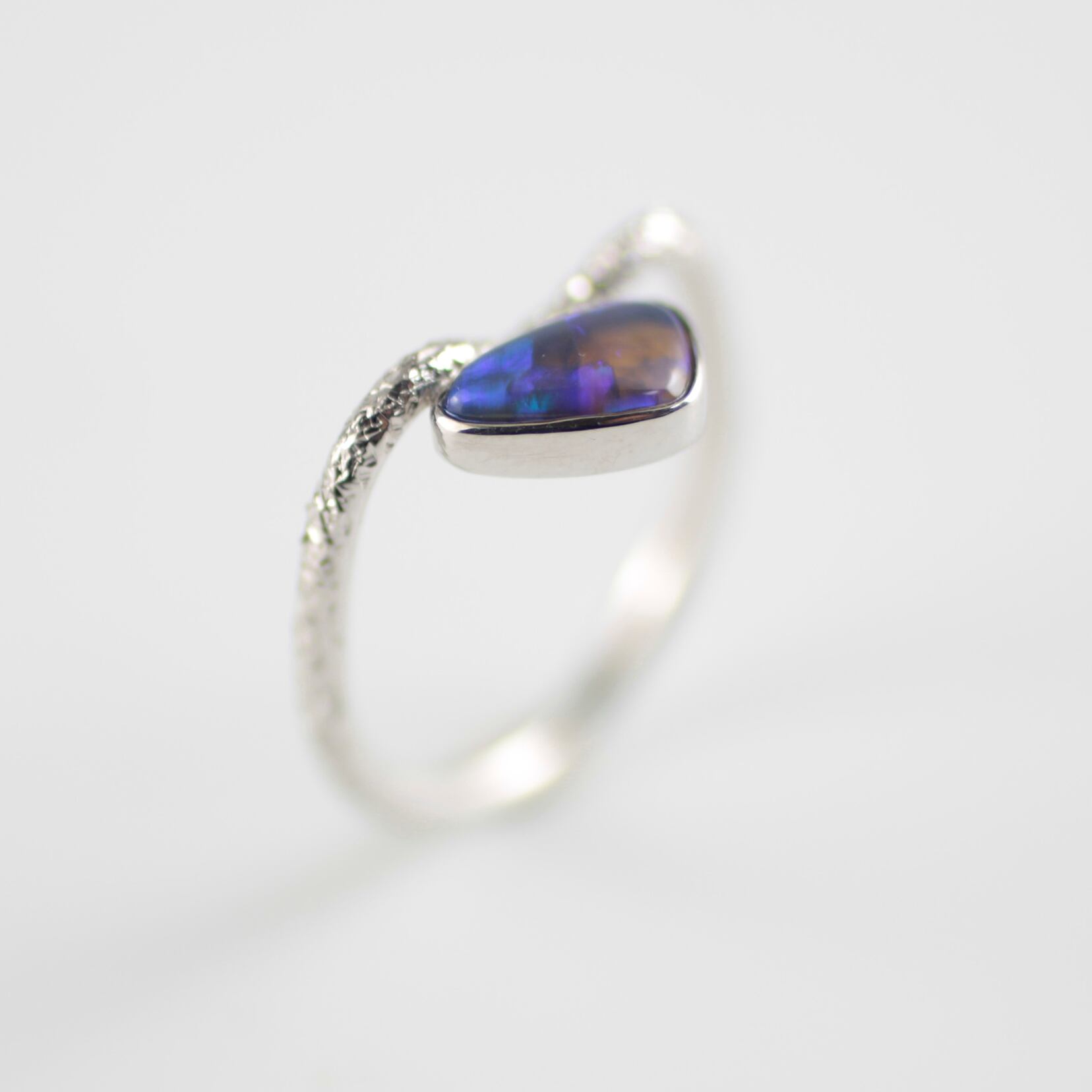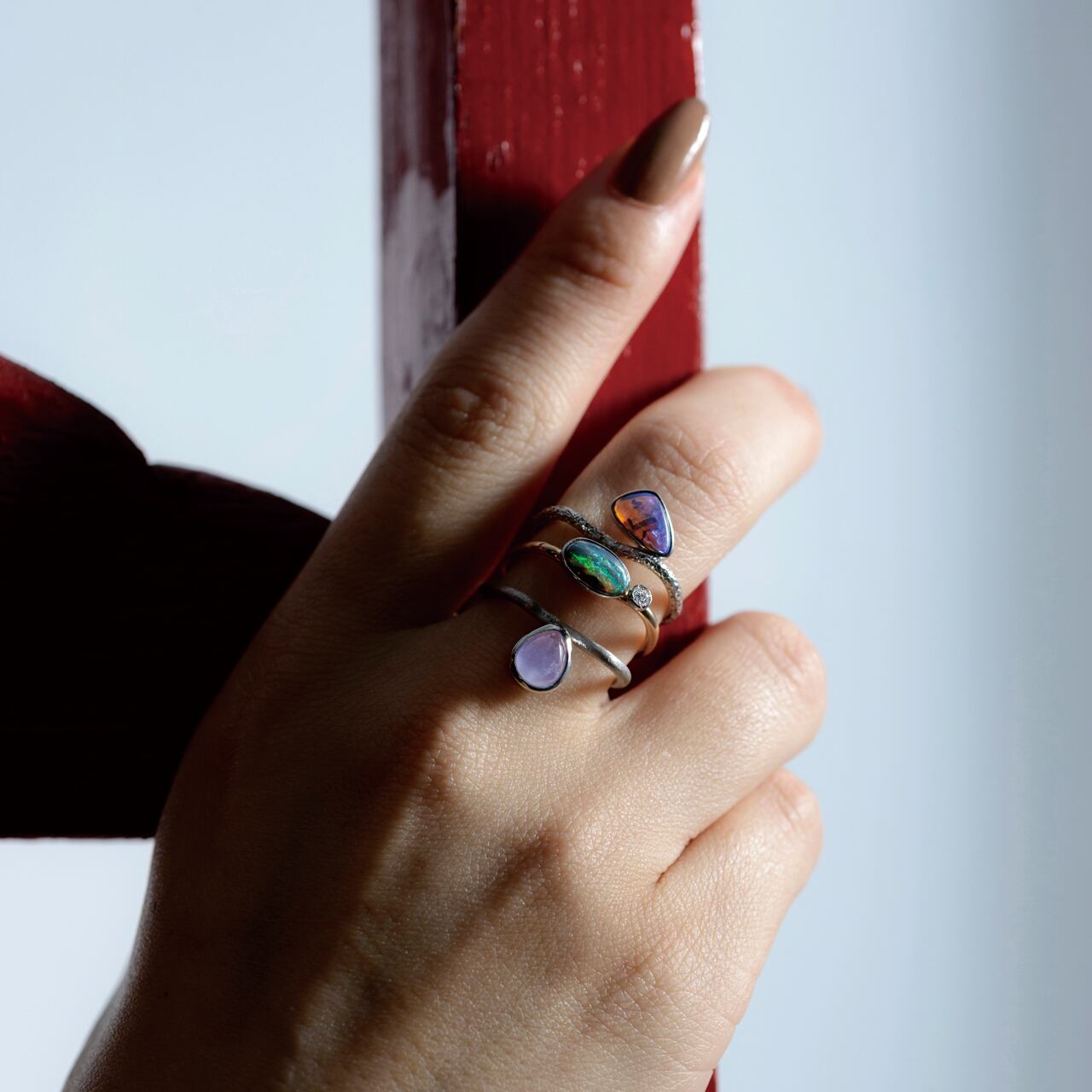 自然の中にある曲線をコンセプトに、ゆるやかなウェーブラインでMを表現いたしました。ちオパールを浮かせる様に取り付けた、他にはない可愛らしいデザインが魅力的です。単品でも、重ね付けしても手元が美しく上品でお洒落な印象になります。真円ではないデザインは、隙間があり複数の指にフィットしますので、実用性もあります。