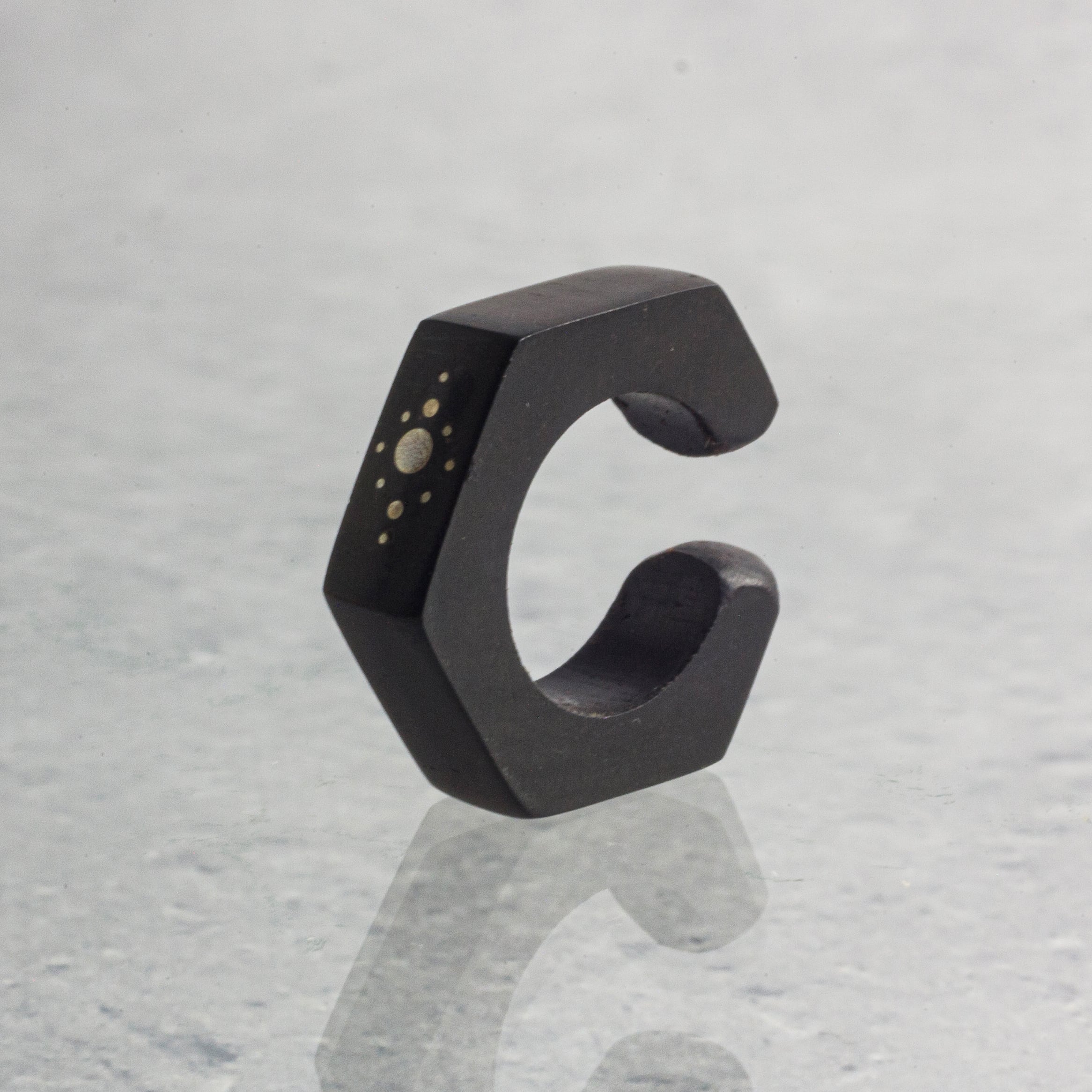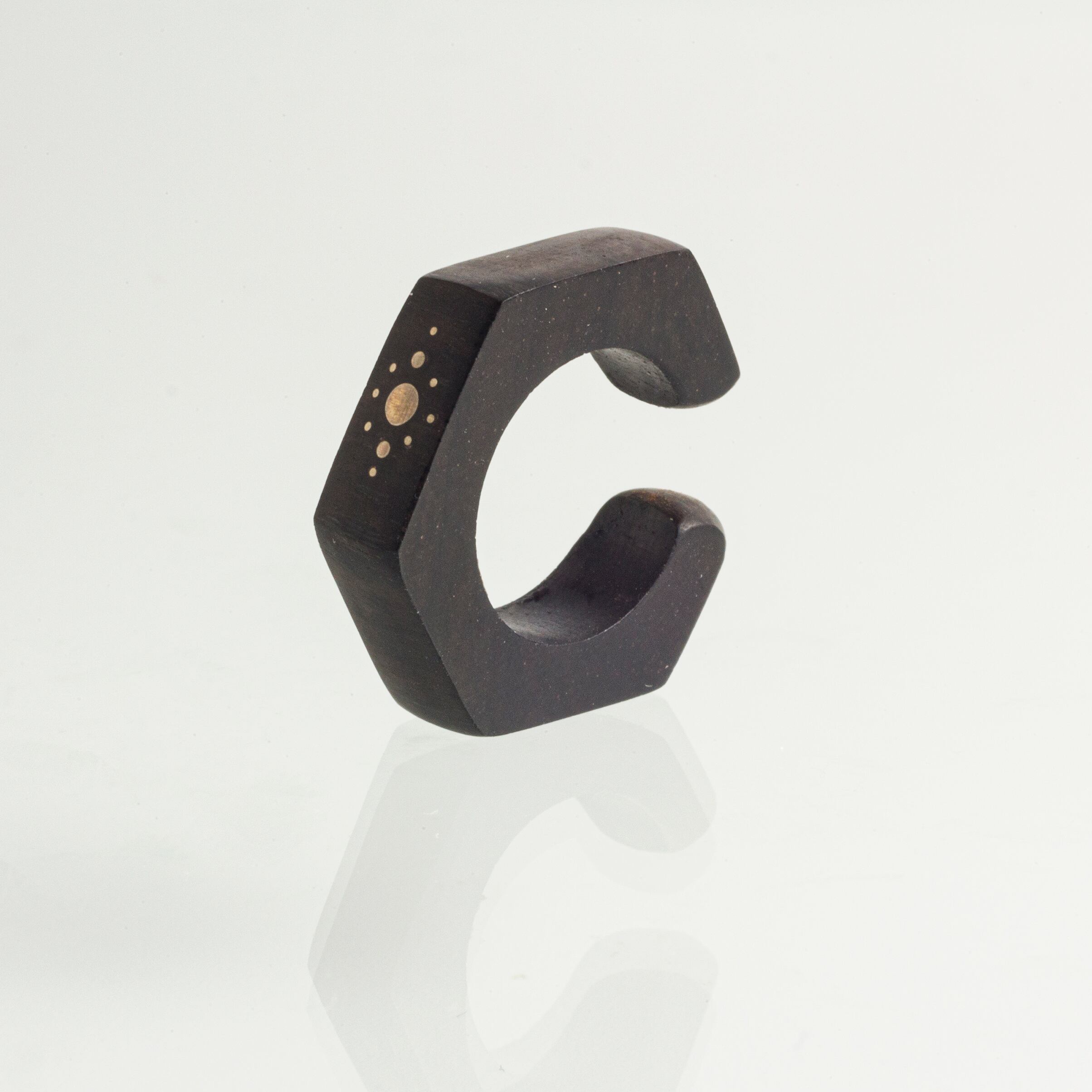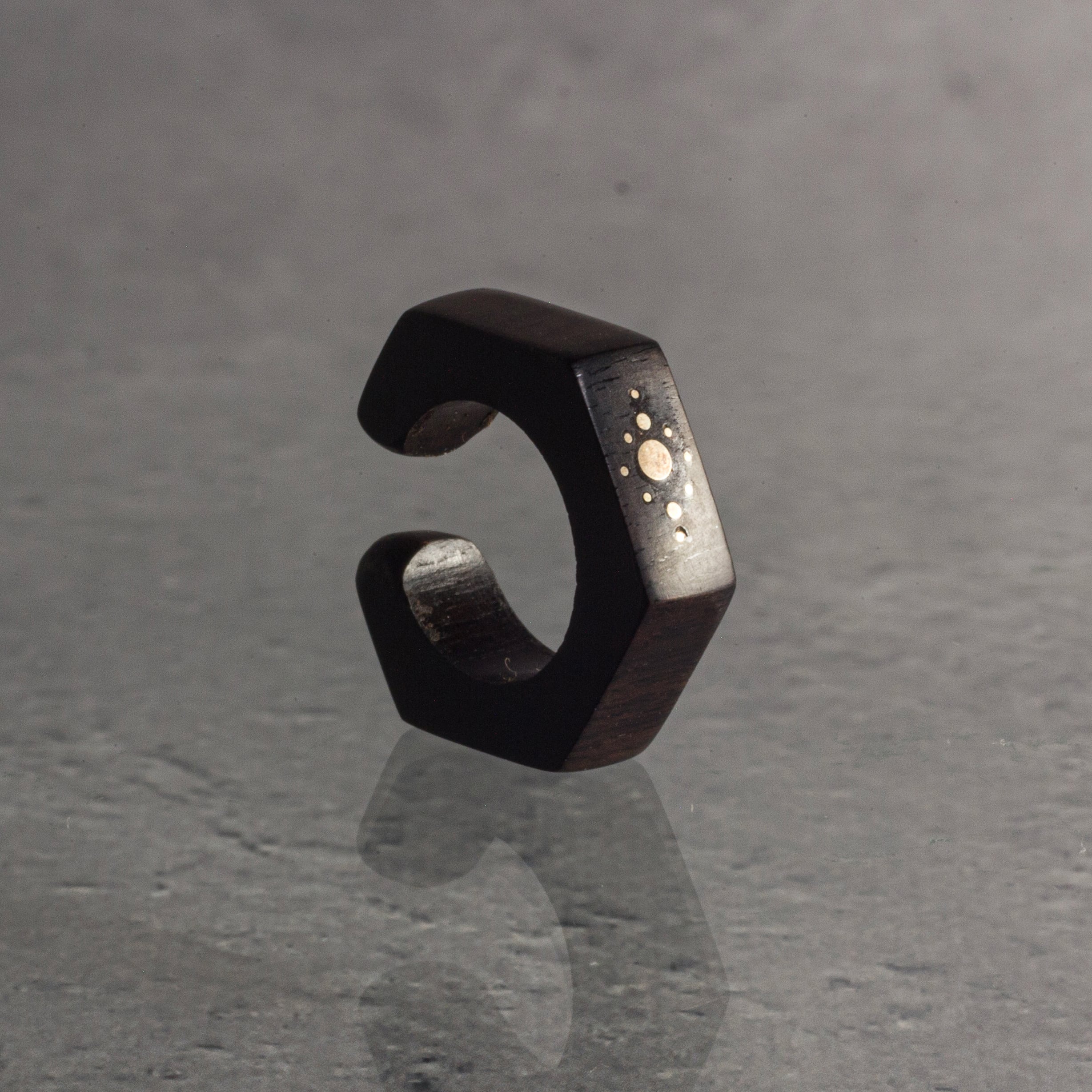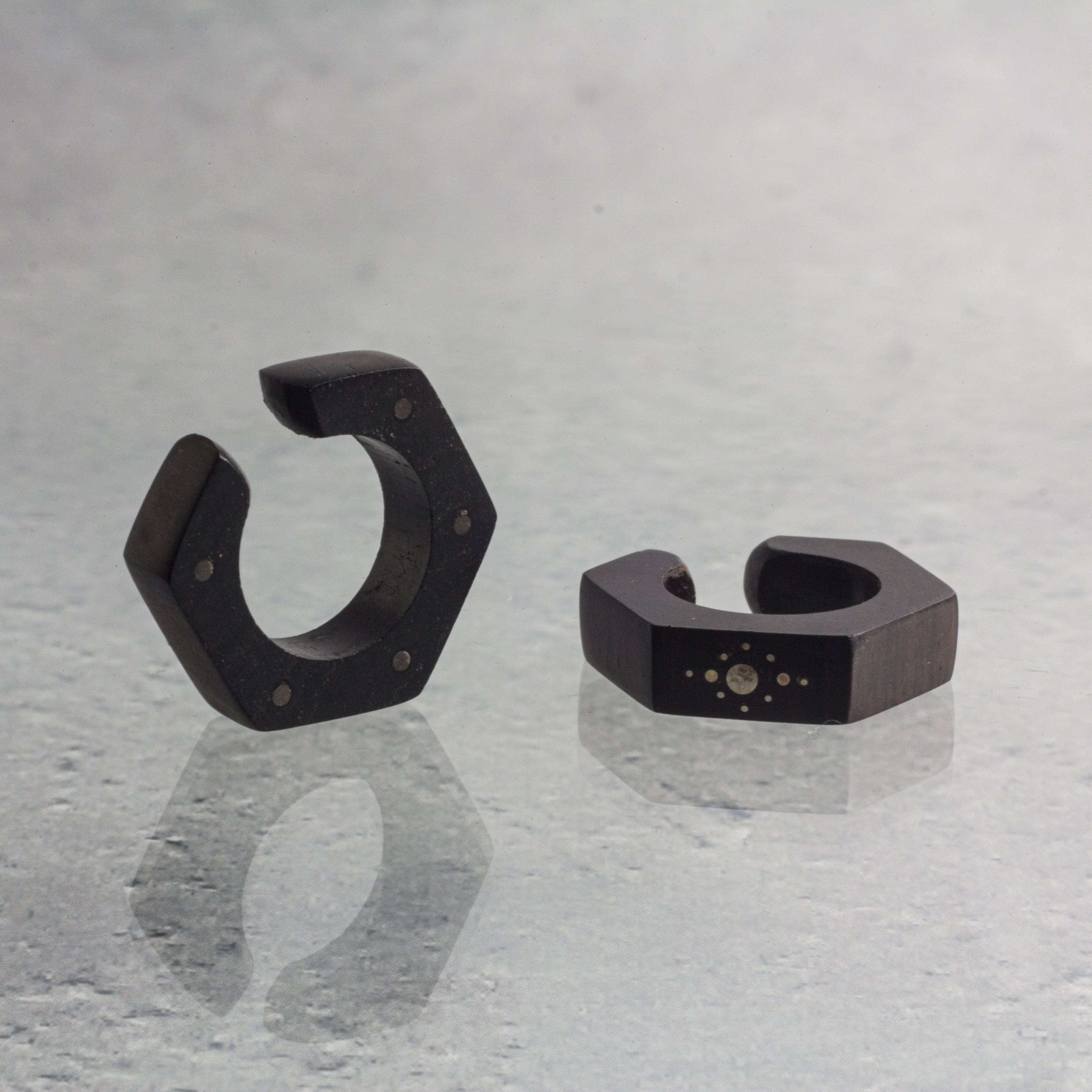 角がシャープな六角形のデザインにsilverの象眼細工で模様を施したイヤーカフ。漆黒の木の上質で光沢感のあるアフリカンブラックウッドに、エッジの効いたクールな印象の組み合わせがアクセントになり、メンズライクなコーデと合わせやすい印象的な耳元を演出いたします。