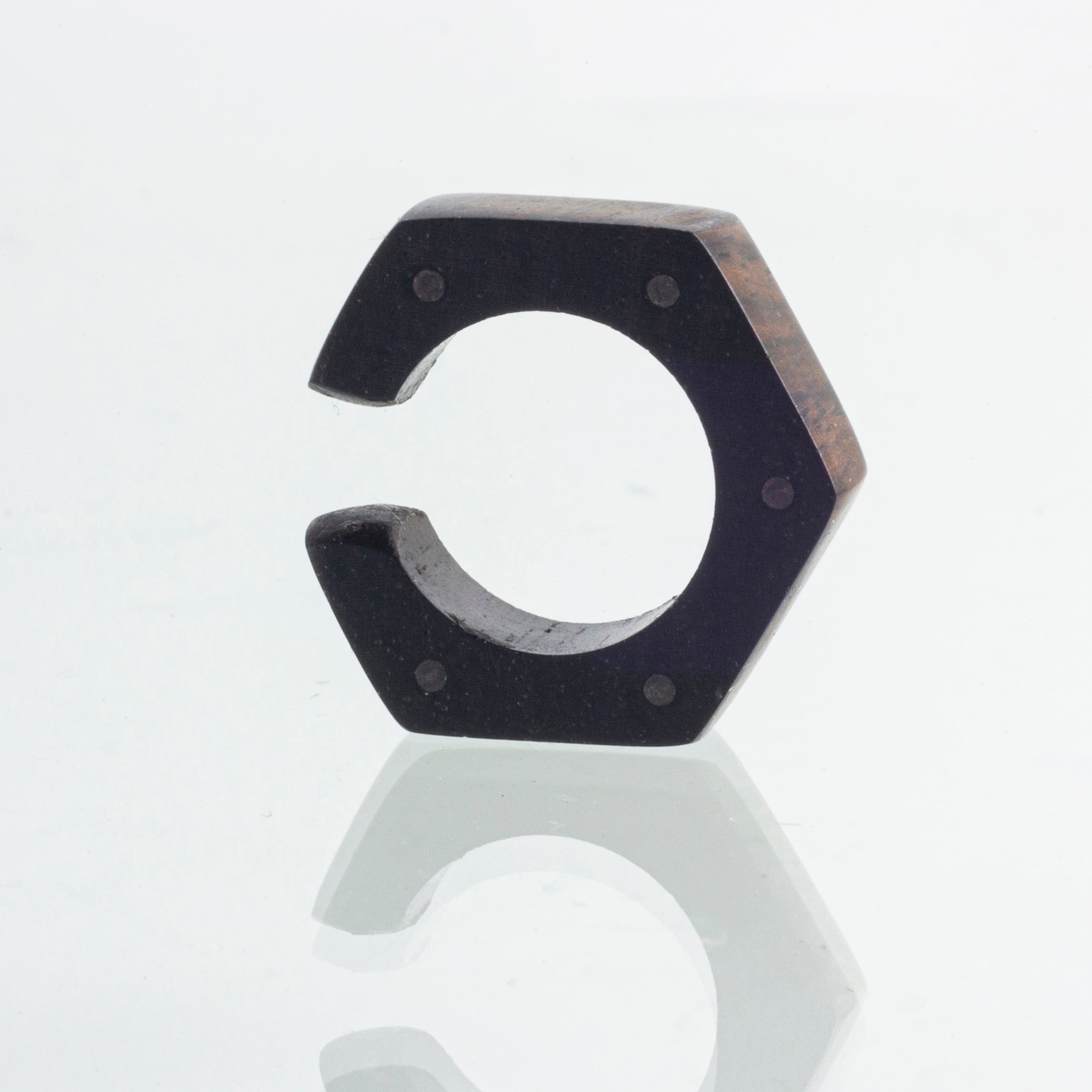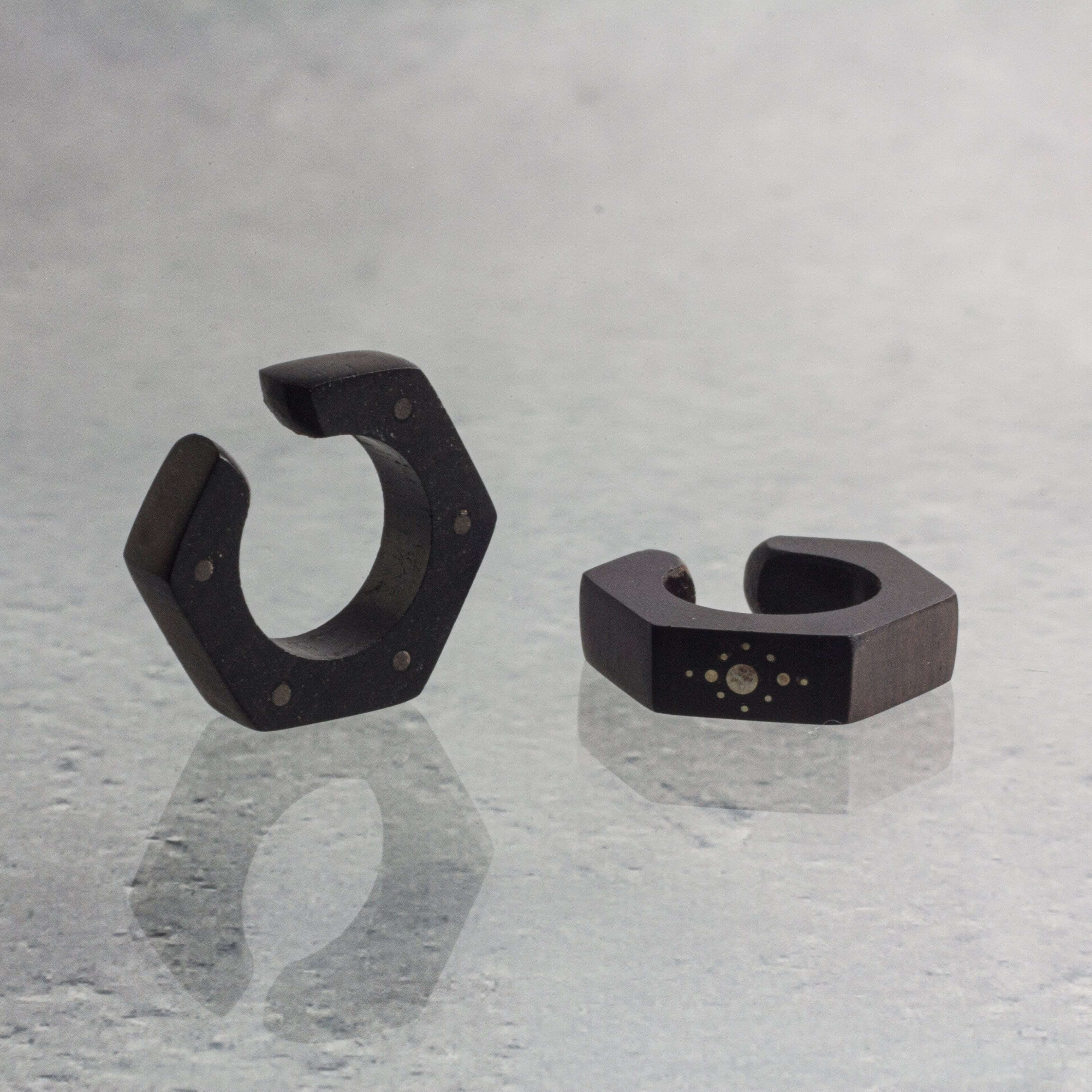 角がシャープな六角形にSV象嵌細工でナットモチーフデザインのイヤーカフ。漆黒の木の上質で光沢感のあるアフリカンブラックウッドに、エッジの効いたクールな印象の組み合わせがアクセントになり、メンズライクなコーデと合わせやすい印象的な耳元を演出いたします。